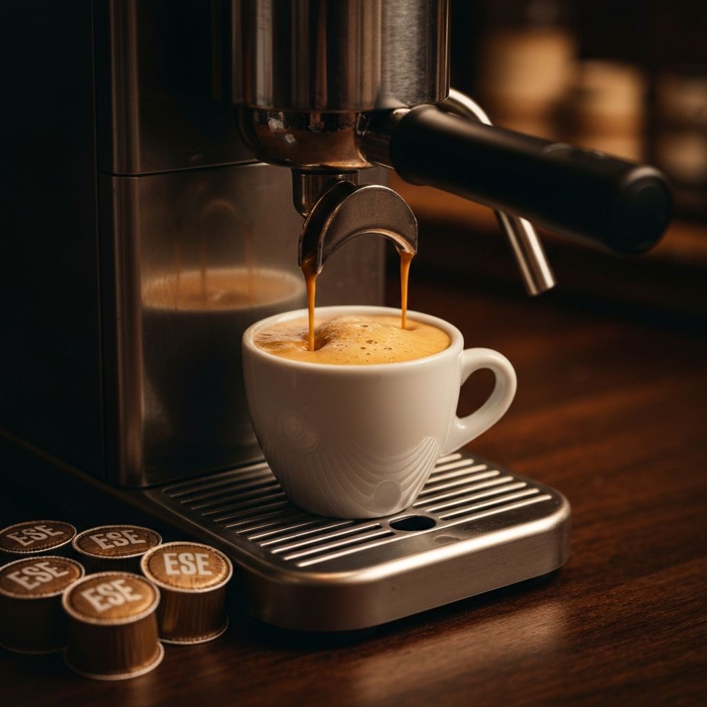 ESE pod extraction — from pod to perfect espresso in under 30 seconds.